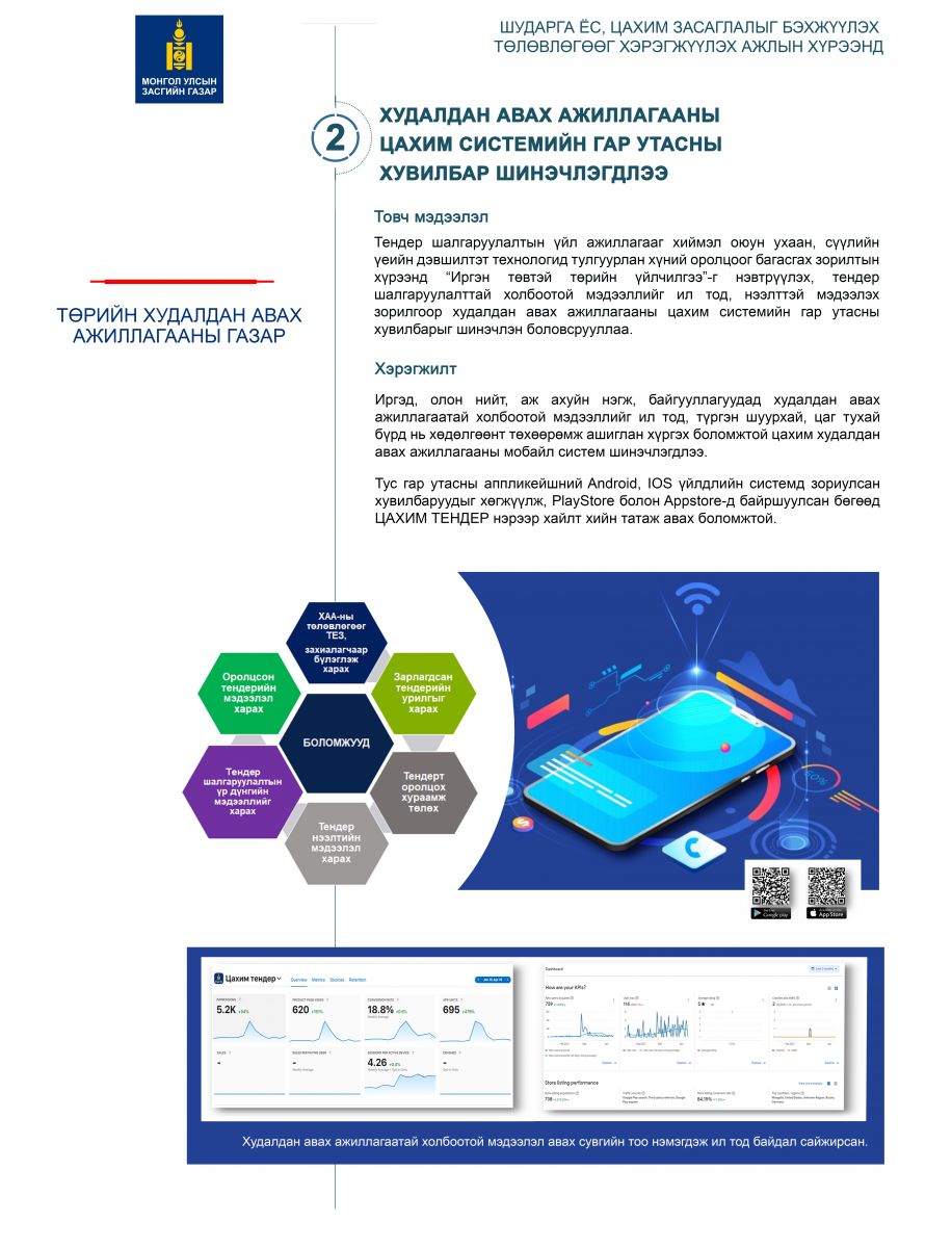 Иргэд, олон нийт, аж ахуйн нэгж байгууллагуудад худалдан авах ажиллагаатай холбоотой мэдээллийг ил тод, түргэн шуурхай, цаг тухай бүрт нь хөдөлгөөнт төхөөрөмж ашиглан хүргэх боломжтой цахим худалдан авах ажиллагааны мобайл систем шинэчлэгдлээ.